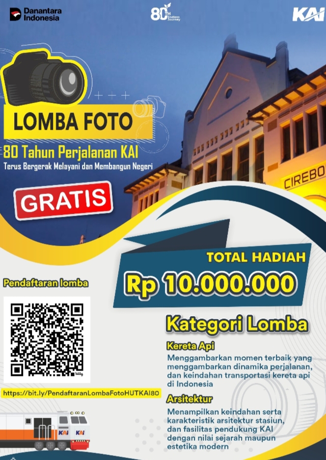 Cirebon, – KAI Daop 3 Cirebon menggelar lomba foto dengan tema “80 Tahun Perjalanan KAI Terus Bergerak Melayani dan Membangun Negeri” untuk memeriahkan peringatan HUT ke-80 KA.