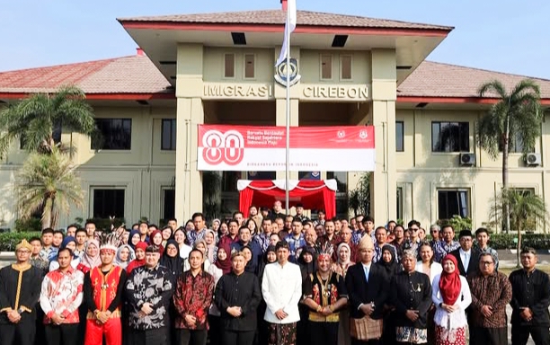 Cirebon – Kepala Kantor Imigrasi Kelas I TPI Cirebon, Komang Trisna Diatmika memimpin langsung sebagai inspektur upacara dalam peringatan Hari Ulang Tahun (HUT) ke-80 Kemerdekaan Republik Indonesia yang berlangsung dihalaman Kantor di Jl. Ki Ageng Tirtayasa Kedawung Cirebon. Minggu (17/8/2025).