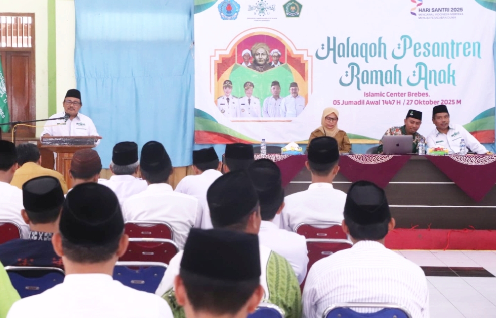 Disampaikan Bupati Brebes Hj Paramitha Widya Kusuma SE MM dalam sambutannya yang dibacakan Kepada Dinas Pendidikan Pemuda dan Olahraga (Dindikpora) Caridah saat membuka Halaqah Pesantren Ramah Anak rangkaian Peringatan Hari Santri Nasional PCNU Kabupaten Brebes, di Aula Islamic Center Brebes. Senin (27/10/2025).